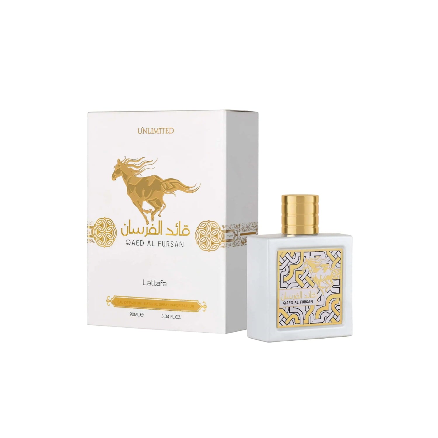 Le parfum "Qaed Al Fursan Unlimited" de Lattafa est une création élégante et luxueuse. Le flacon blanc immaculé avec des motifs dorés évoque la pureté et la sophistication. Il est orné d'un cheval en mouvement, symbole de puissance et de noblesse, qui se retrouve également sur la boîte assortie. Le bouchon doré ajoute une touche finale de raffinement.